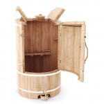 Круглая кедровая бочка со скошенной крышкой обеспечивает широкий обзор для пациента, что создает больший комфорт при принятии процедур.Считается одной из популярных и недорогих моделей среди домашних вариантов.